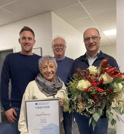 In einem bewegenden Abschied wurde Brigitte Werning nach beeindruckenden 30 Jahren von Julian Wöstmann, Georg Bolte und Edgar Zieschang (v. l.) sowie dem herzlichen Kollegenkreis in den Ruhestand verabschiedet. Der 3. Januar 1994 markierte den Beginn ihrer Reise, zu einer Zeit, als Branchenkenntnisse noch Neuland für sie waren. Doch mit unerschütterlichem Willen eignete sie sich eigenständig sämtliches Wissen an und entwickelte sich rasch zum „Abrechnungsgenie“ für Projekte jeglicher Größe.