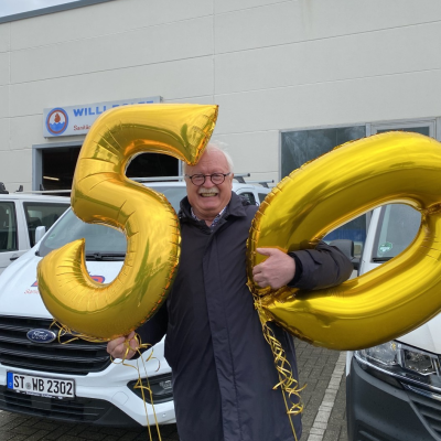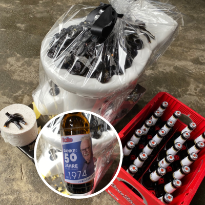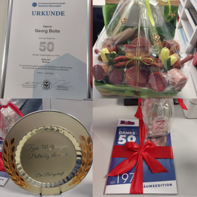 Die Geschäftsführung und die Belegschaft der Bolte KG dankte ihrem Chef mit einer kleinen Überraschungsparty. Luftballons, Currywurst, Lakritz im Klo und Bier mit Bolte-Konterfei gab es zur Erheiterung.